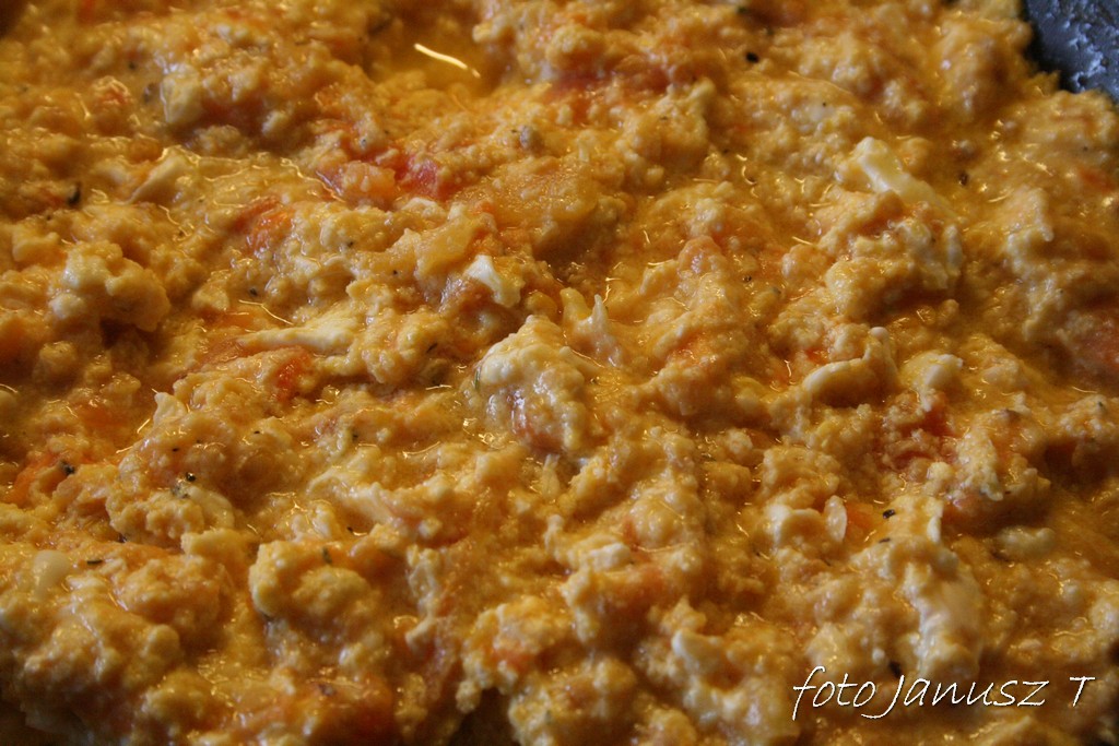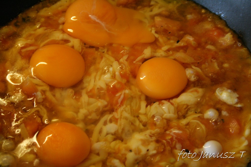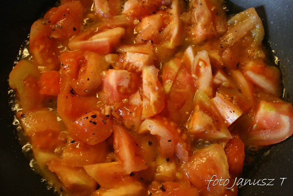 Cebulę podsmażamy do zeszklenia, dodajemy pomidory i co chwilę mieszamy aż z części pomidorów zrobi się pasta, dodajemy jajka i ciągle mieszamy do usmażenia jajek.