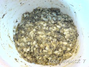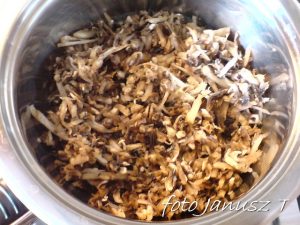 Pieczarki zetrzeć na tarce o grubych oczkach, cebulę drobno pokroić i lekko podsmażyć dodać pieczarki i dusić ok 10 min – odparować.