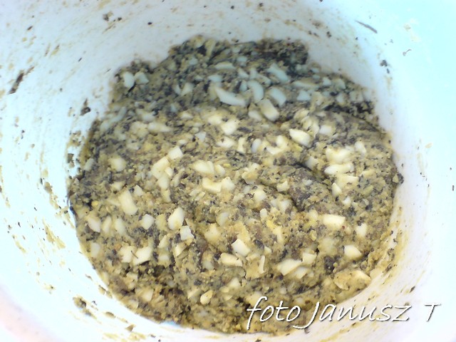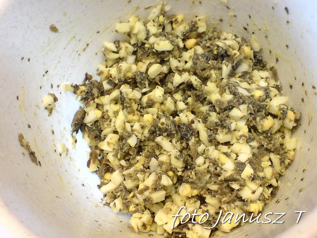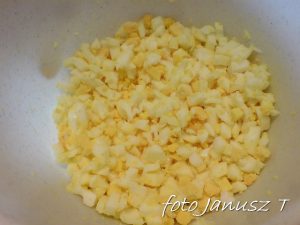 4 jajka ugotować na twardo, drobno pokroić (używam siatki do warzyw o małych oczkach).