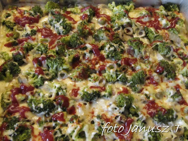 Wracamy do ciasta,  jeszcze chwilę je wyrabiamy, po czym rozwałkujemy i układamy na blaszce – wcześniej wysmarowanej margaryną i posypanej mąką. Następnie ciasto smarujemy sosem i posypujemy niewielką ilością sera, układamy pieczarki, boczek  i cebulę, ponownie lekko posypujemy serem, dalej układamy brokuły i oliwki i posypujemy pozostałym serem.
