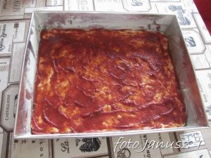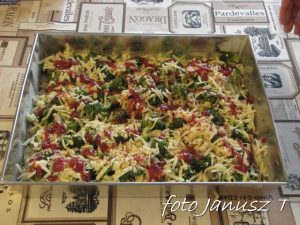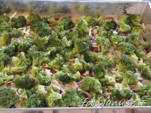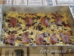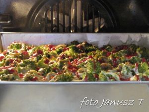 Wracamy do ciasta,  jeszcze chwilę je wyrabiamy, po czym rozwałkujemy i układamy na blaszce – wcześniej wysmarowanej margaryną i posypanej mąką. Następnie ciasto smarujemy sosem i posypujemy niewielką ilością sera, układamy pieczarki, boczek  i cebulę, ponownie lekko posypujemy serem, dalej układamy brokuły i oliwki i posypujemy pozostałym serem.