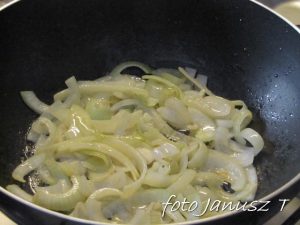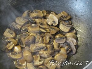 Rozgrzewamy patelnię, wlewamy 3 łyżki oliwy i podsmażamy boczek lekko z obu stron, po czym odkładamy na ręcznik papierowy, żeby go odsączyć.  Pokrojoną w pół- talarki cebulę wrzucamy na patelnię – lekko podduszamy, podobnie robimy z pokrojonymi w grubsze plastry pieczarkami.