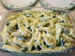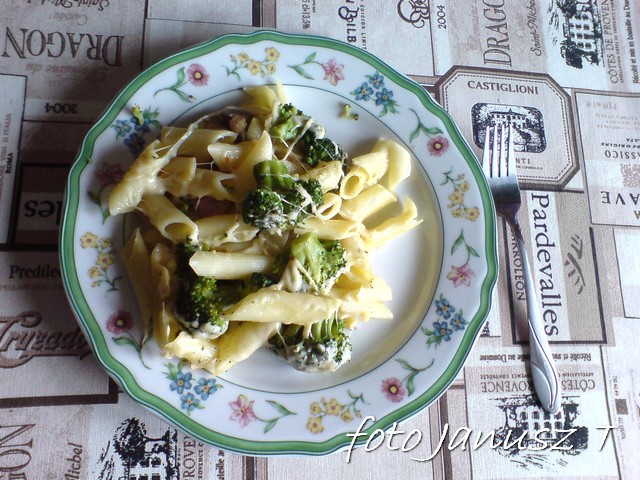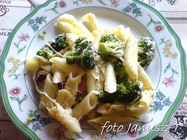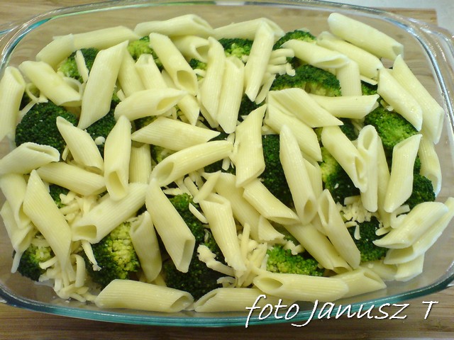 Makaron gotujemy ( al dente ), brokuł rozdrabniamy na różyczki i gotujemy 5 min.