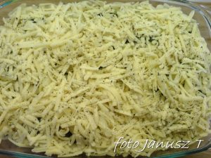 Naczynie żaroodporne smaruję oliwą i układam 2 warstwy makaronu, po czym lekko posypuję serem. Dalej układam makaron posypując serem. Kolejna warstwa makaronu i układam brokuły posypując serem. Układam ostatnią warstwę makaronu, który przykrywam całkowicie serem i posypuję bazylią, każdą warstwę sera również możemy posypać bazylią, lub przyprawą którą preferujemy.